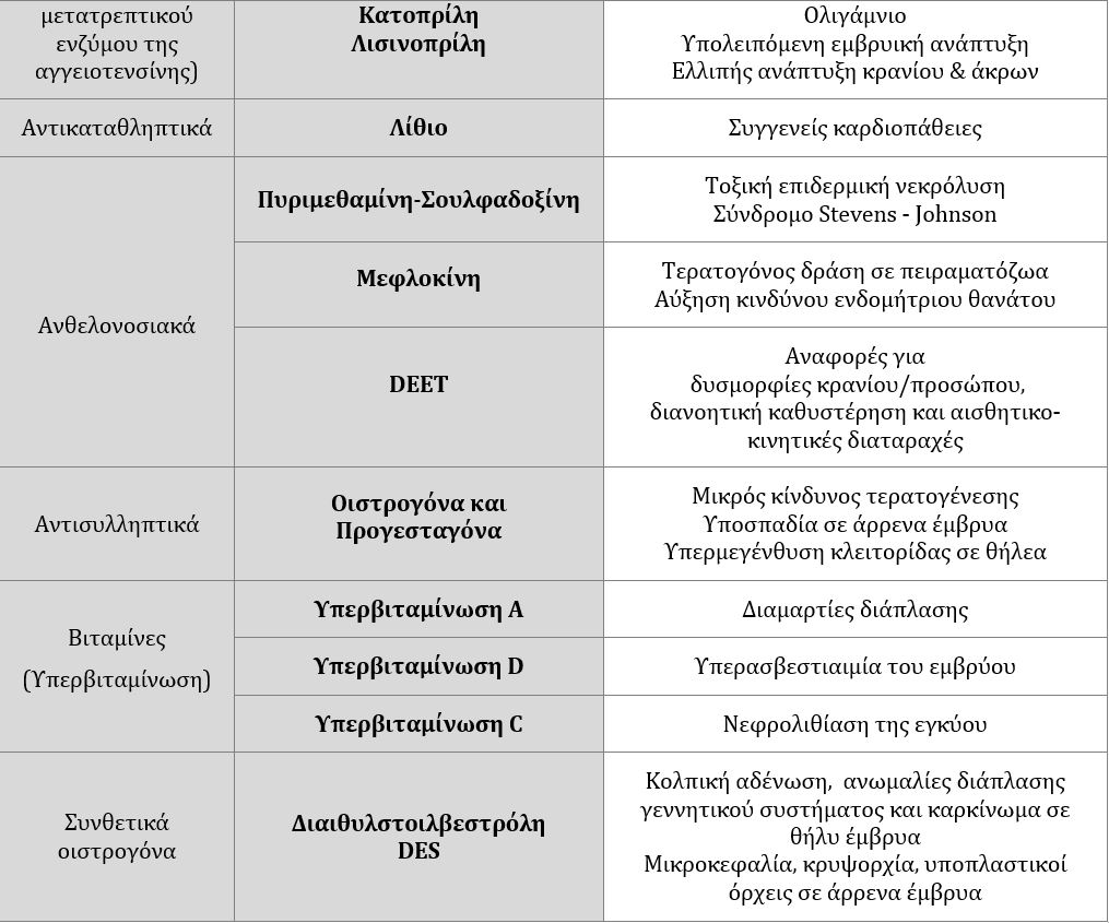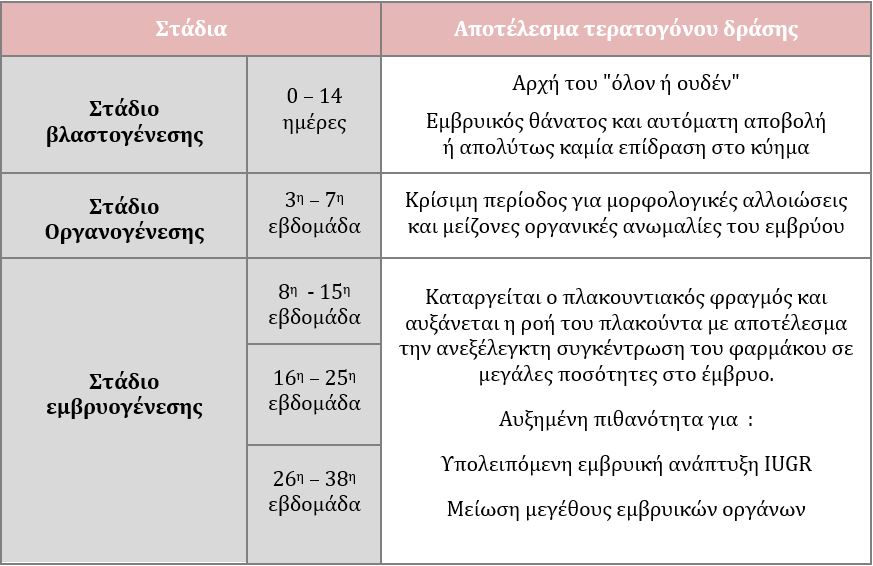 Η λήψη φαρμάκων κατά την εγκυμοσύνη θα πρέπει, σε γενικές γραμμές είτε να αποφεύγεται είτε να πραγματοποιείται για το μικρότερο χρονικό διάστημα και στη μικρότερη αποτελεσματική δόση έχοντας σταθμίσει το αναμενόμενο όφελος έναντι του σχετικού κινδύνου και πάντοτε κατόπιν σχετικής ιατρικής οδηγίας. Ο κίνδυνος των πιθανών βλαβών στο έμβρυο μπορεί να είναι ελάχιστος για αρκετά από τα φάρμακα που χρησιμοποιούνται ευρέως στην εγκυμοσύνη, ενώ αντιθέτως άλλα φάρμακα χαρακτηρίζονται από αμιγώς τερατογόνο δράση και δεν χορηγούνται. Επιπρόσθετα, ο σχετικός κίνδυνος αρκετών φαρμάκων έχει τεκμηριωθεί μόνο από μελέτες σε πειραματόζωα, οι οποίες δεν μπορούν να πραγματοποιηθούν στον άνθρωπο, έχοντας έτσι άγνωστες επιδράσεις στο αναπτυσσόμενο έμβρυο.