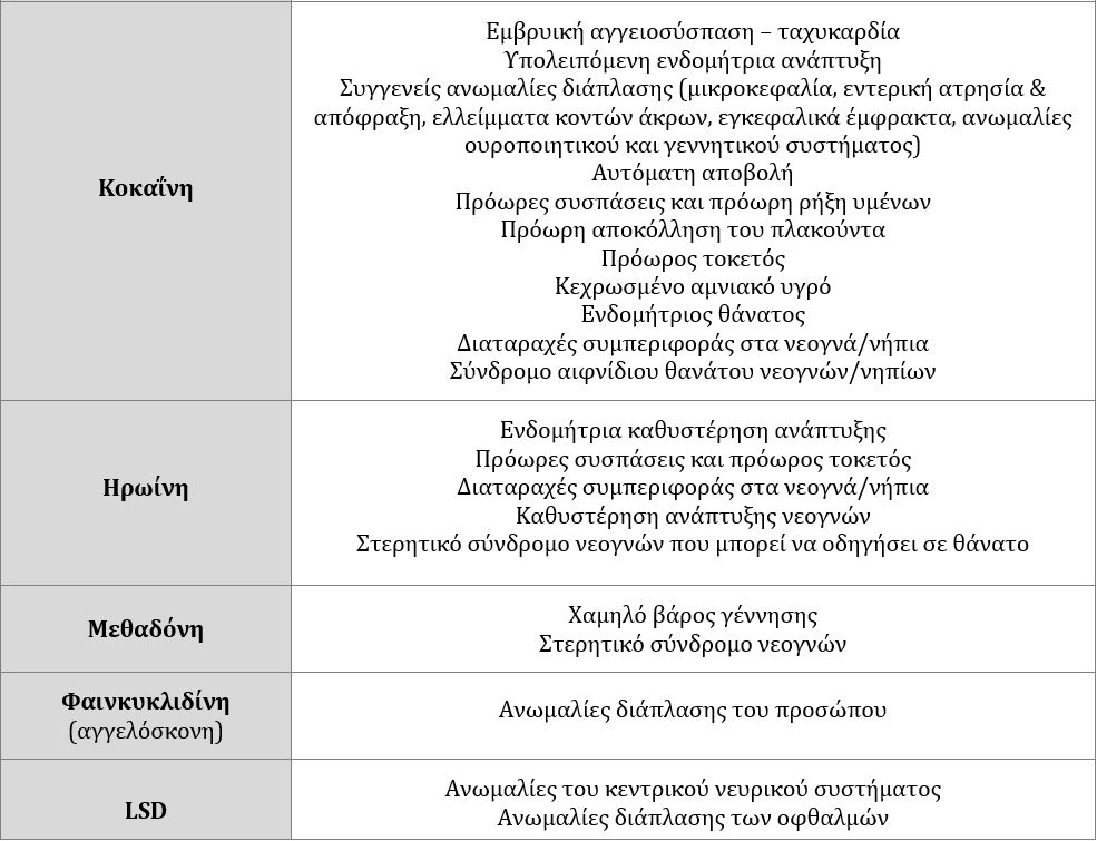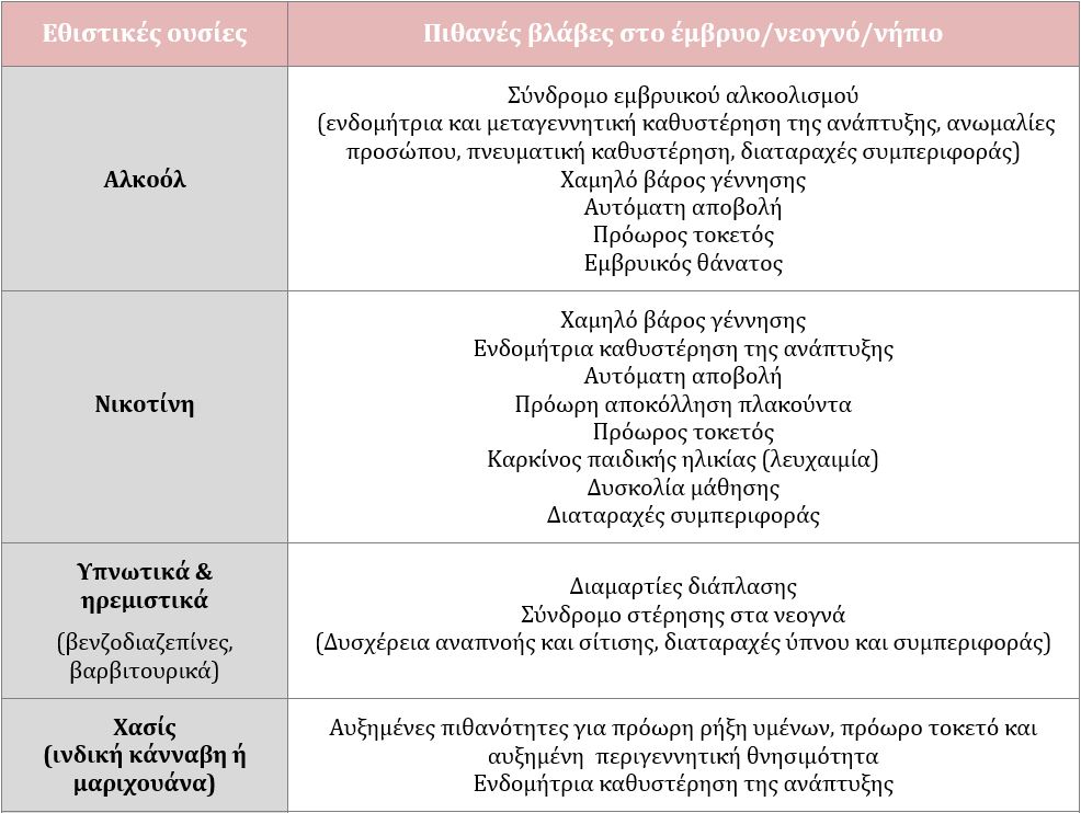 Η χρήση εθιστικών ουσιών κατά τη διάρκεια της εγκυμοσύνης σχετίζεται με την εμφάνιση επιπλοκών στην γενικότερη υγεία της κυοφορούσας μητέρας και την πρόκληση σωματικών και ψυχολογικών ανωμαλιών-διαταραχών του εμβρύου- νεογνού. Οποιαδήποτε χρήση τους απαγορεύεται αυστηρώς κατά τη διάρκεια της εγκυμοσύνης και του θηλασμού.